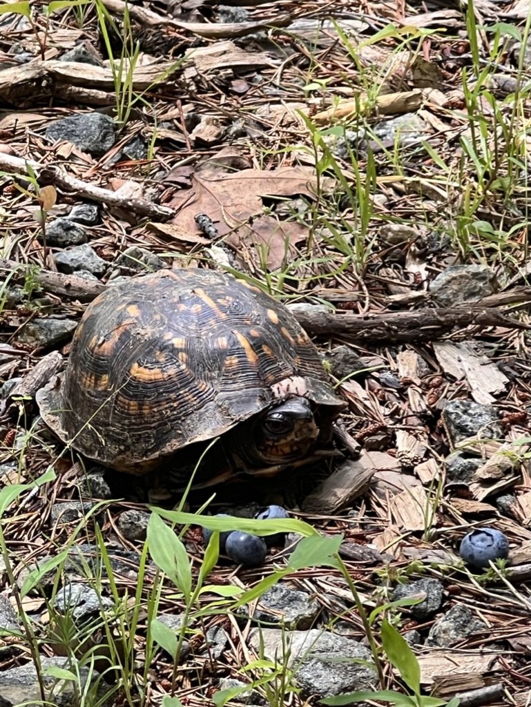 An Eastern Box Turtle on the farm, enjoying some blueberries freshly picked from one of our blueberry bushes.