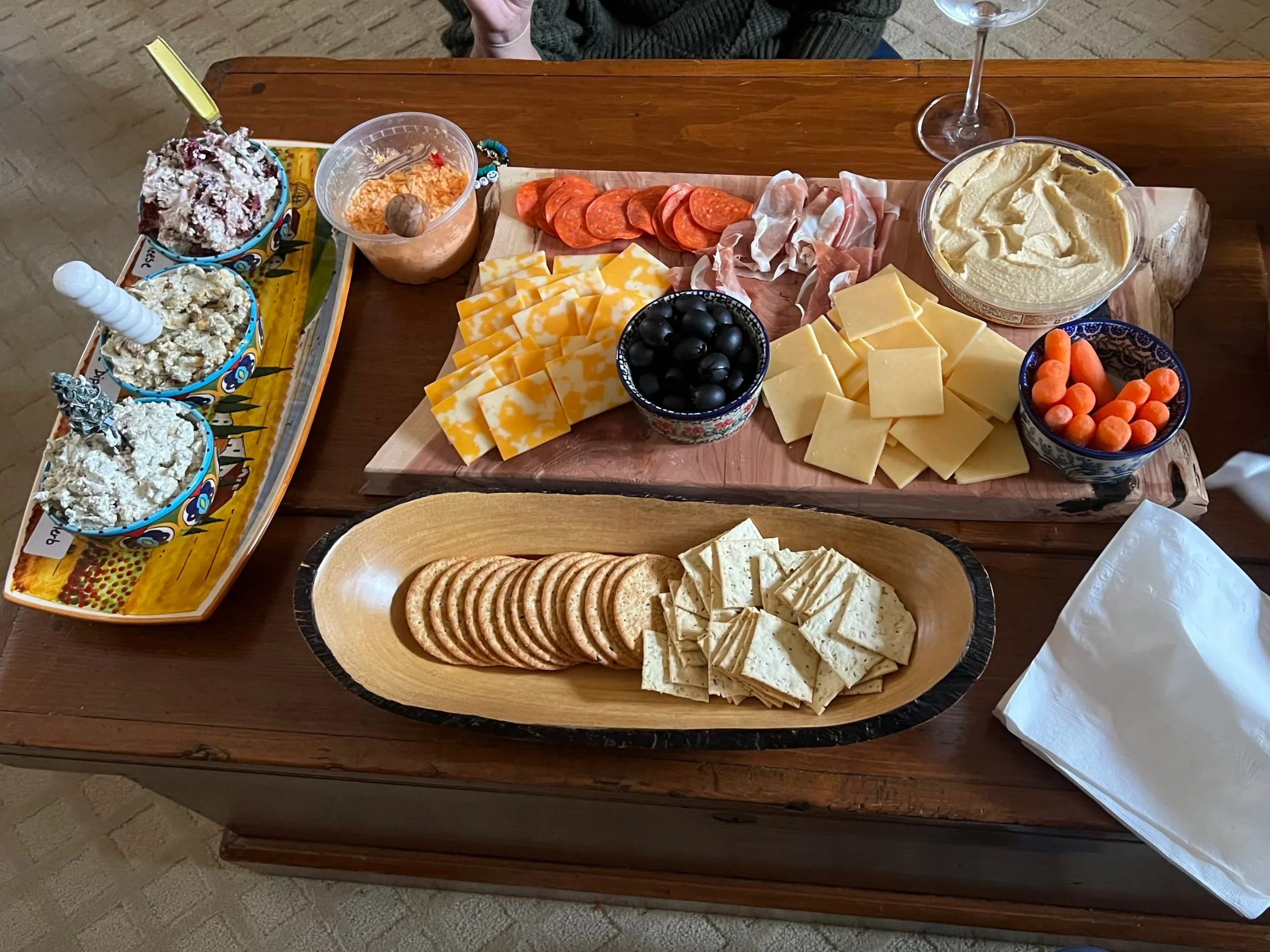 An appetizer spread using local cheeses and cured meats, Giardino Foresta cheese dips, and served on one of our charcuterie boards.